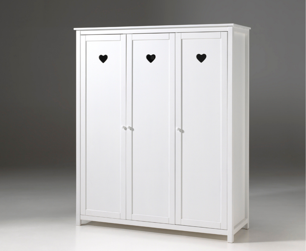 The white 3-door wardrobe combines a timeless, fresh design with soft, romantic accents. It's a favorite room for anyone who appreciates elegant furniture. The wardrobe features two shelves and one hanging rail on the left side. Behind the right door are four shelves, providing ample space for storing clothes, bed linens, and more. Let yourself be seduced by the charm of this room with its heart-shaped detail.