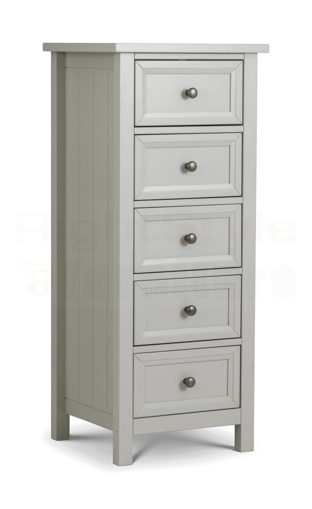 Maine Is An Elegant New England Style Range Of Bedroom Furniture. The Combination Of Exquisite Dove Grey Lacquered Finish With Characteristic Side Panelling And Detailed Chamfered Cabinetry Makes For A Soothing And Refined Aesthetic With Timeless Appeal, While Delicate Pewter Handles Add The Perfect Finishing Touch. The Maine 5 Drawer Tall Chest's Compact Footprint Makes It A Great Storage Solution For Smaller Bedrooms.