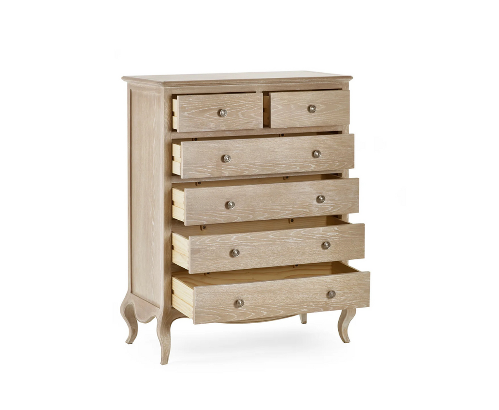 Inspired by French design, the Camille bedroom range boasts beautiful curves and soft lines. Featuring traditional ornate details – this collection exudes elegance, and includes: a 2-drawer bedside, 4+2 chest, 6 drawer wide chest, combination wardrobe and dressing table with stool. Match with the Camille bed to conclude the look immaculately.