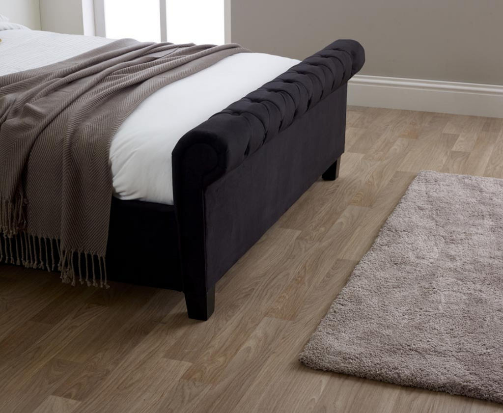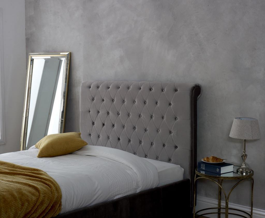 Elegant scrolls feature on this modern bedstead. With fine button detailing on boththe headboard and footend, this bedis designed to stand out.