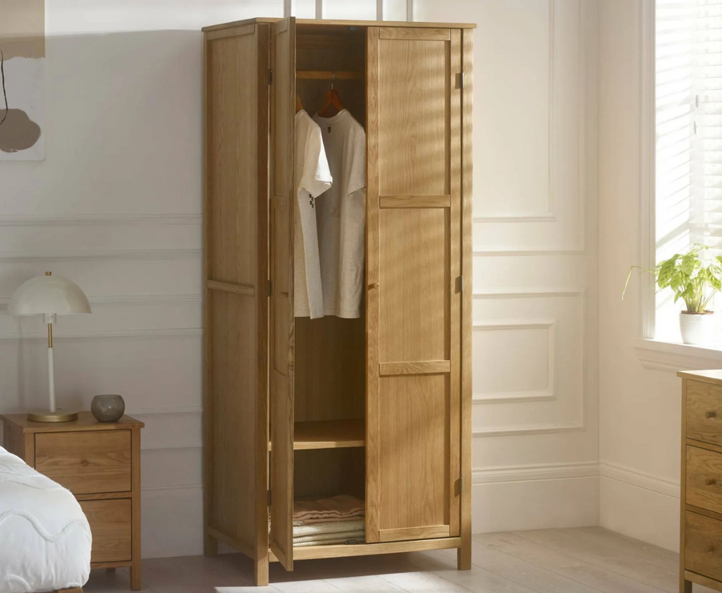 Enhance your bedroom with the Coxmoor Wardrobe in oak, a sophisticated storage solution that combines style and practicality. Crafted with clean lines and a classic oak finish, this wardrobe offers ample hanging space for clothes, along with a convenient shelf for folded items or accessories. The sleek design, complemented by elegant knob handles, allows it to fit seamlessly into any bedroom, while the natural wood grain adds warmth and character to your space. Simple assembly makes it easy to set up.