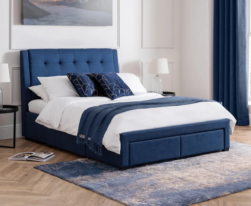 The Fullerton Bed is upholstered in a luxurious grey linen fabric with small black legs. This bed features a deep buttoned headboard, creating a contemporary, modern design suitable for a wide range of decor. Offering 4 spacious drawers, two at the end and one each side, this bed provides practicality with its storage features, allowing you to use the maximum space in your bedroom for other needs. Available in 135cm Double, 150cm King and 180cm Super King sizes.