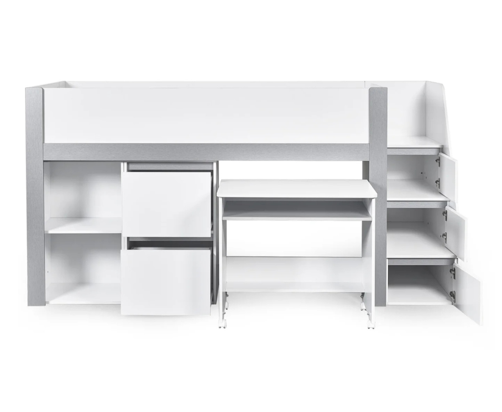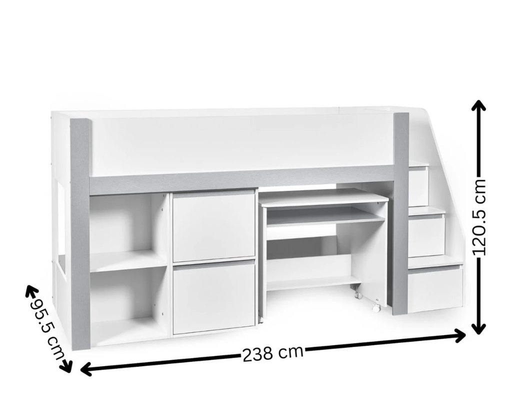 Make the most of your child’s space with this functional and stylish mid sleeper bed, designed to support sleep, study, and storage all in one compact footprint. Finished in a sleek white and silver colourway, this contemporary midsleeper bed fits seamlessly into modern kids’ bedrooms. It features a pull-out desk on smooth castors, integrated drawers, and open shelving compartments perfect for keeping books, toys, and school supplies neatly stored. The fixed ladder includes hidden cupboard storage, offering additional convenience without taking up extra room. Built from durable wood, it's a smart, long-lasting solution for growing families. Mattress sold separately.