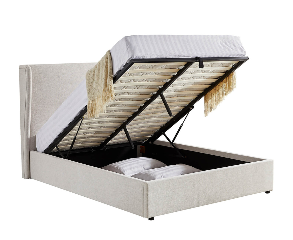 Matilda 5ft Ottoman Bed in Cashmere combines elegant design with smart functionality. Upholstered in a soft cashmere-toned fabric, it features a winged headboard for a refined look, generous under-bed storage, and a supportive slatted base, making it a stylish and practical choice for modern bedrooms.