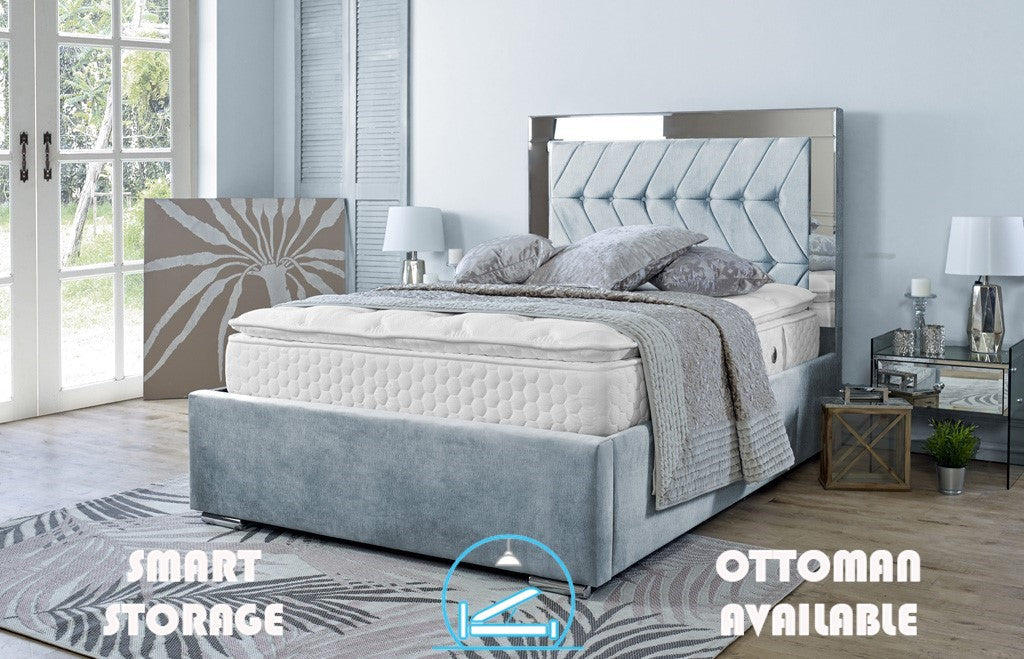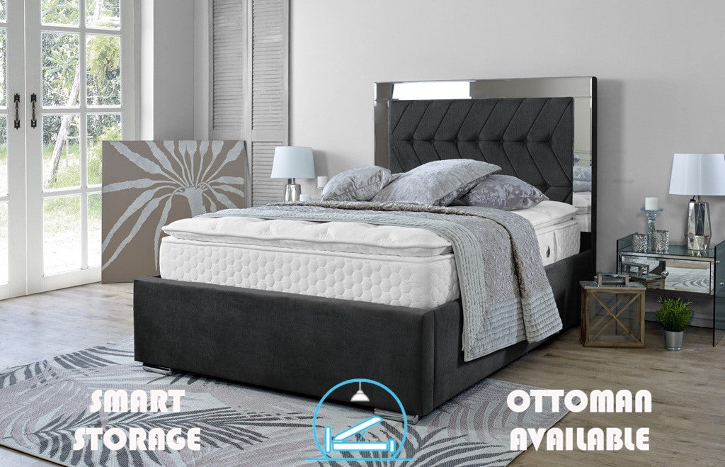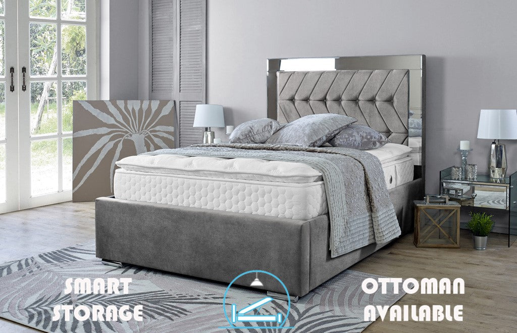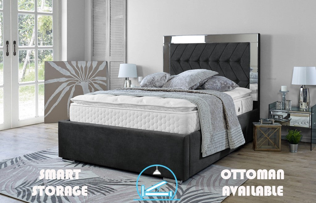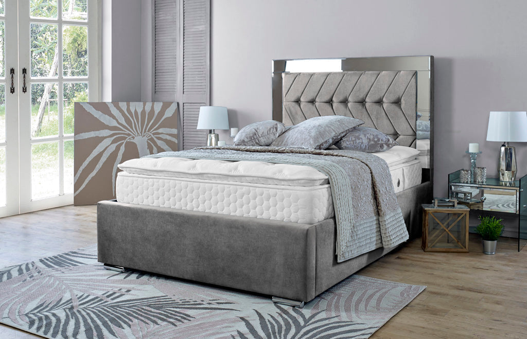 Our Exclusive Parié Standard Bed Frame Is Part Of Our New La Glance Mirrored Bed Frame Range With An Exquisite Inlayed Mirrored Panel & Deep Button Chevron Headboard The Parié Takes Inspiration From The Classic Art Deco Period Of Exploration In Design Each Panel Is Individually Upholstered To The Highest Standards To Create This Timeless Styled Bed Frame Available with Fabric Or Diamte Buttons *Also Available With A Luxury Ottoman Option, See Our Ottoman Bed Section For More*