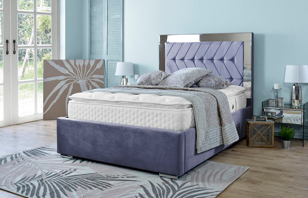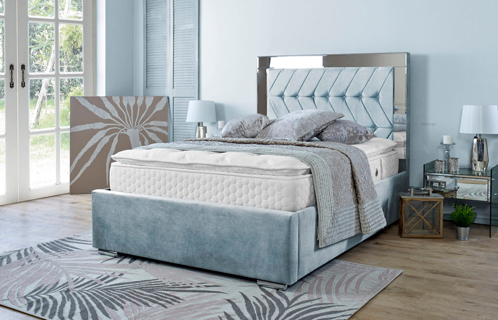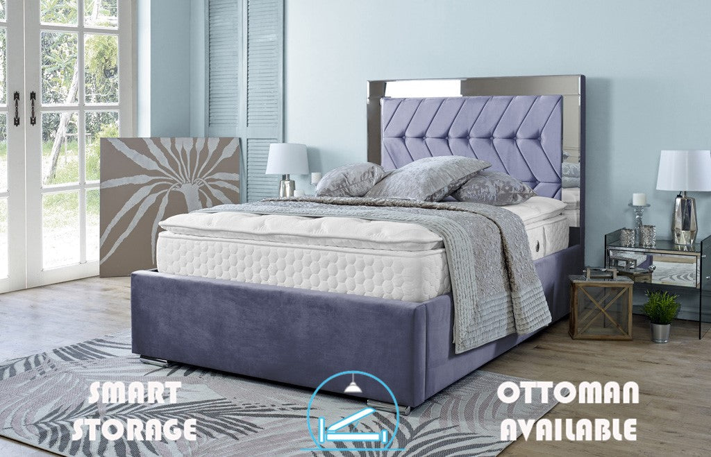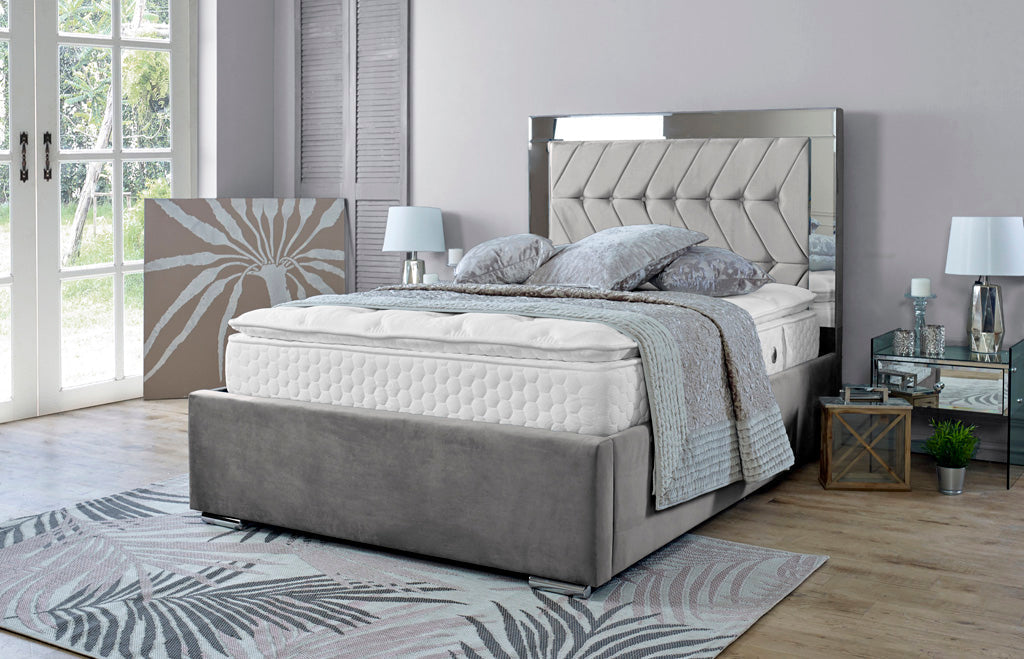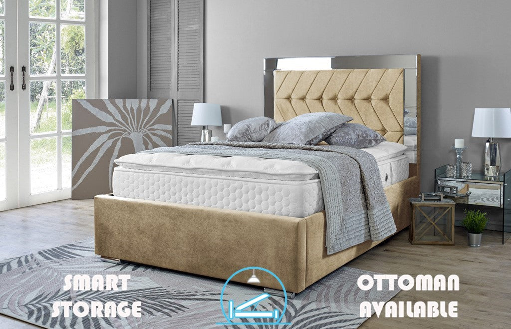 Our Exclusive Parié Standard Bed Frame Is Part Of Our New La Glance Mirrored Bed Frame Range With An Exquisite Inlayed Mirrored Panel & Deep Button Chevron Headboard The Parié Takes Inspiration From The Classic Art Deco Period Of Exploration In Design Each Panel Is Individually Upholstered To The Highest Standards To Create This Timeless Styled Bed Frame Available with Fabric Or Diamte Buttons *Also Available With A Luxury Ottoman Option, See Our Ottoman Bed Section For More*
