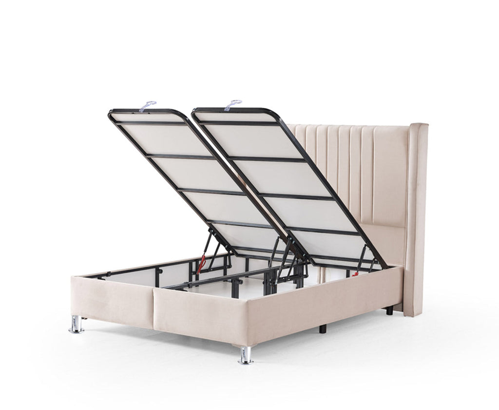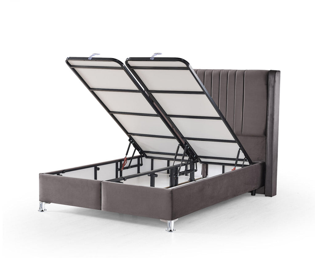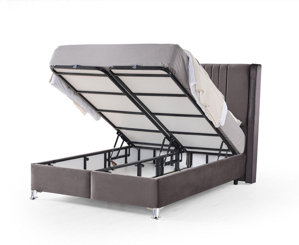 Introducing our brand new WINGZ range of ottoman beds. The Roma Storage Ottoman Bed Frame is part of the new innovative WINGZ collection where you decide whether to add the headboard wings to your bed or not. Each bed comes with a set of wings and it’s up to you to add them or, add them at a later date to give you that new bed feel! The Roma incorporates a modern headboard with a modern vertical ottoman base. Available in French velvet grey or sand velvet. Choose either 4ft 6, 5ft or 6ft.