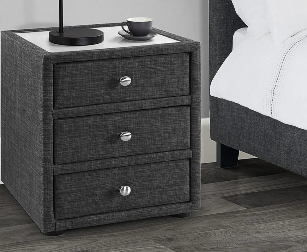 The Sorrento Bedside Cabinet is upholstered in a sophisticated slate grey linen fabric and features three well-sized drawers. It is topped with a tempered glass surface for added practicality. It is a perfect accompaniment for both of Sorrento and Santorini beds, which are presented in the matching fabric.